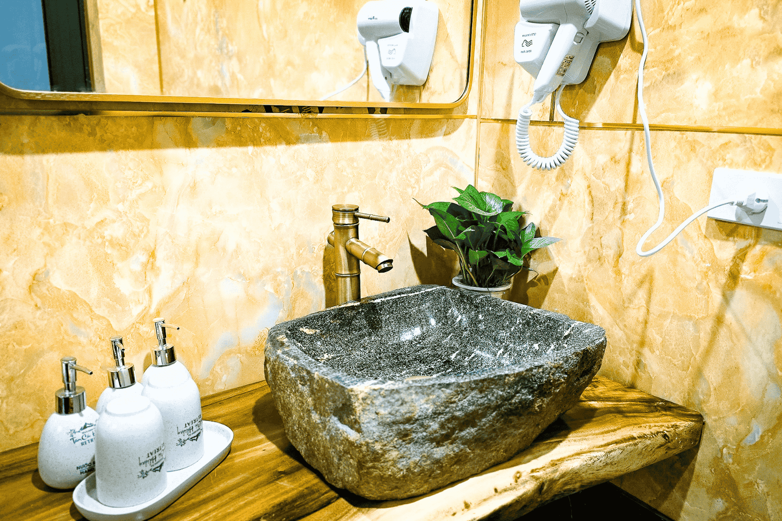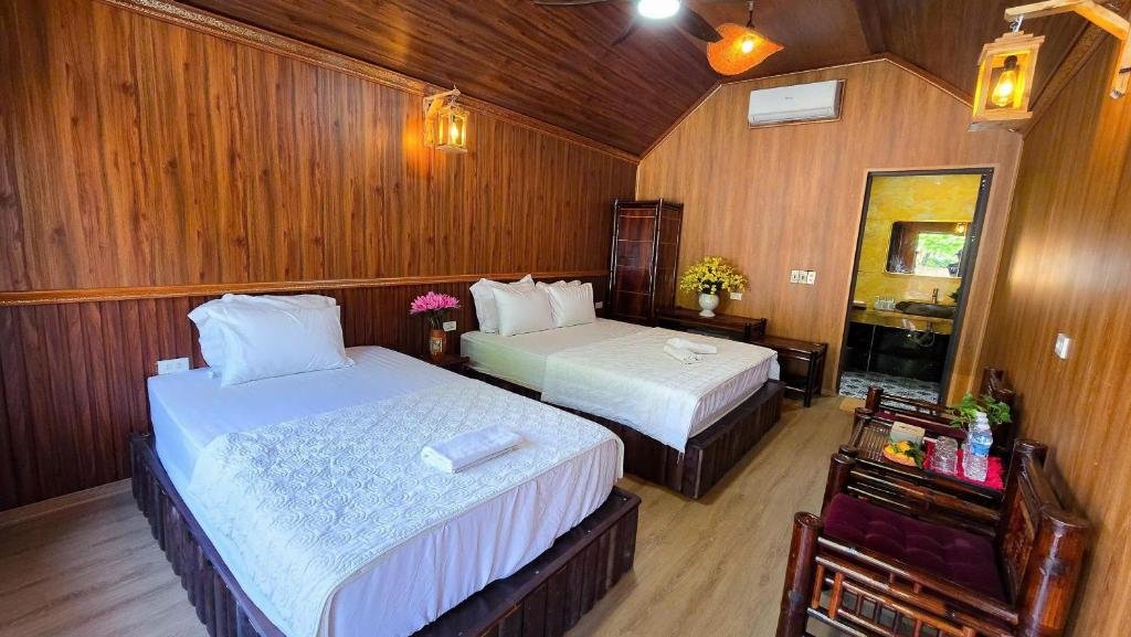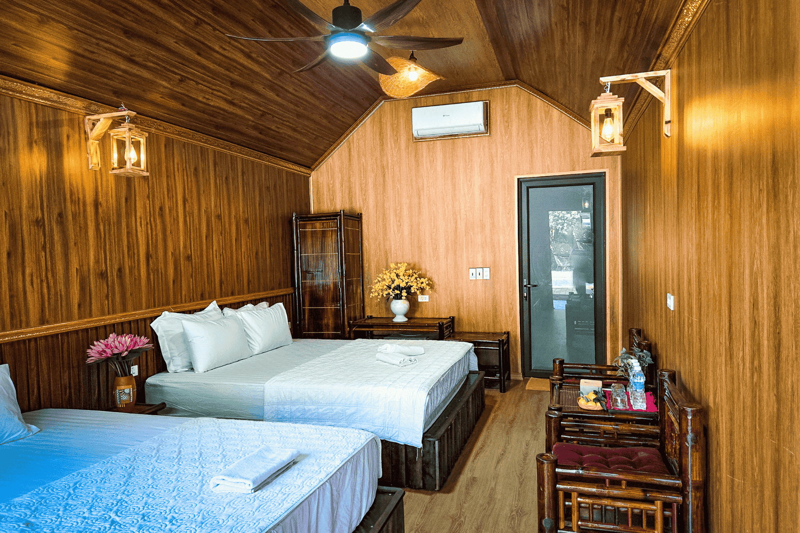Relax in our Triple Bungalow, featuring a private pool with breathtaking views. This air-conditioned bungalow offers one spacious bedroom with two comfortable beds and a modern bathroom complete with a walk-in shower and hairdryer. Thoughtfully designed for both comfort and convenience, the bungalow includes a seating area, work desk, wardrobe, and soundproof walls. Wake up to serene poolside vistas and enjoy a tranquil stay in a stylish, fully furnished retreat perfect for small groups or families.